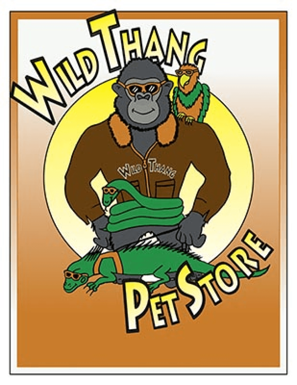 A logo I designed with rather specific requests from the client: A gorilla wearing a leather jacket with a parrot, a snake, and an iguana. This is a flyer cover.