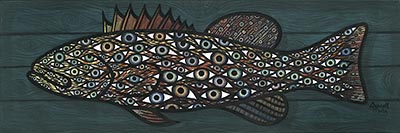 This is the painting that launched my ‘fish mounts’ series. Wanted to paint a crazy mounted trophy fish. And as I’ve mentioned several times I love fish, I love eyes, and I’m intrigued by animals evolving eyes as decoration to frighten predators. After this painting I got the idea to paint and ‘mount’ cutout fish. These are available under the first ‘Cutouts’ page.