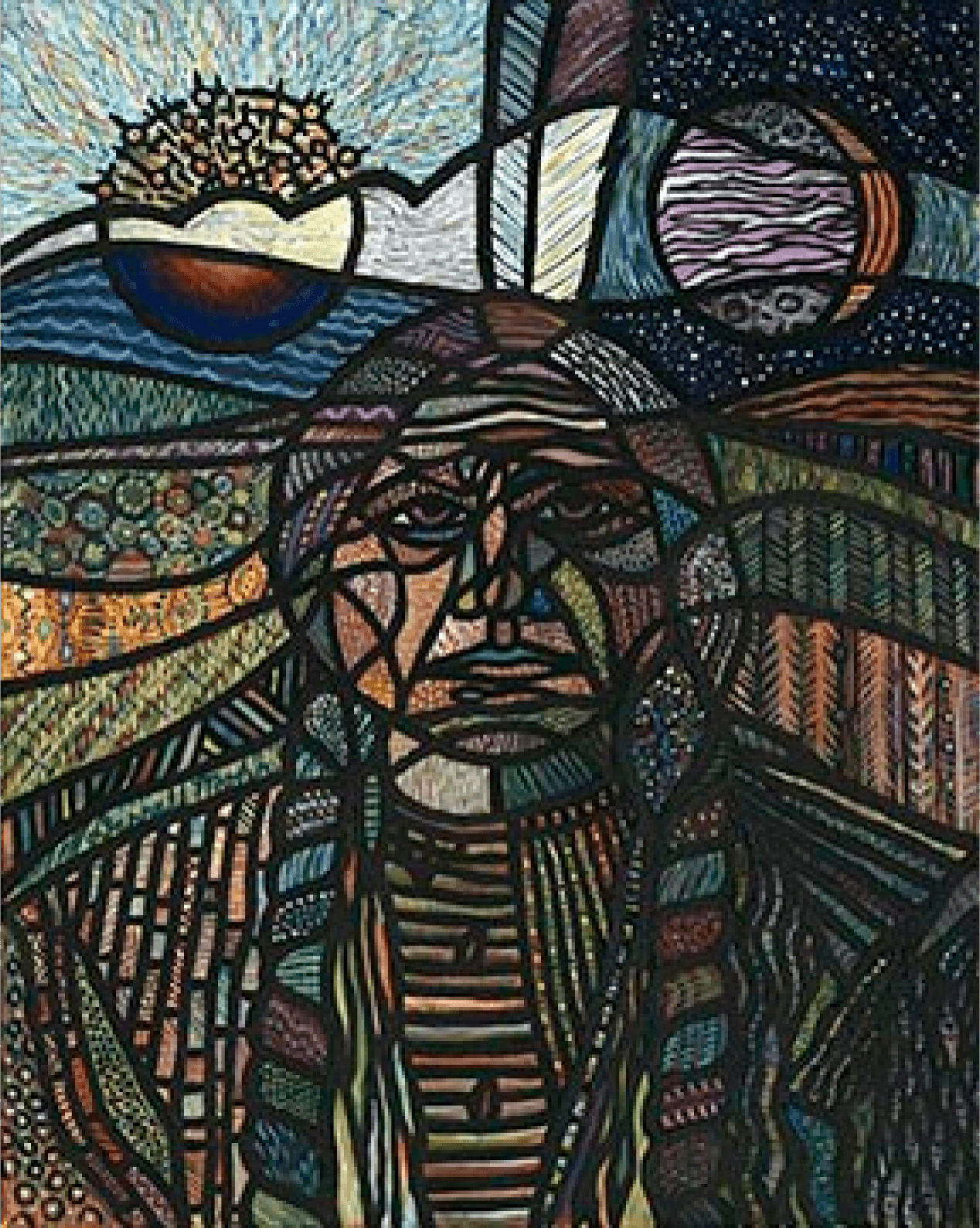 As a young boy I was fascinated with Indian culture. I used to read a lot of books about Indians and during Deadwood’s annual hometown celebration the Sioux would come ride horses and walk in the parade. Then they would go dance, for ‘change’ people would throw on the ground. Pissed me off, but still thought they portrayed themselves with dignity. Loved the dances and loved their dress. Thought I would portray the Sioux medicine man and eventual warrior Sitting Bull in my stained glass style. Wanted to fill the shapes with a mix of geometric and organic patterns.