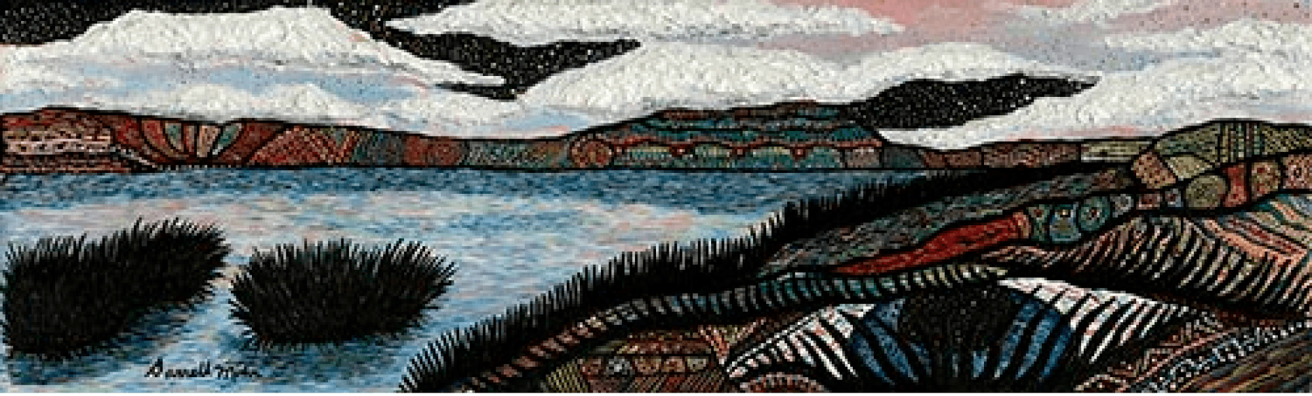 This is a painting based on a photo of one of my favorite fishing spots. Started working on the painting, and while looking at the gaps between clouds I thought sometimes during daylight you almost forget the stars in the sky. Also played off how the gaps between the clouds mimicked the clouds themselves. Plus I love incorporating eyes into landscapes as a metaphor for Mother Earth looking for respect.