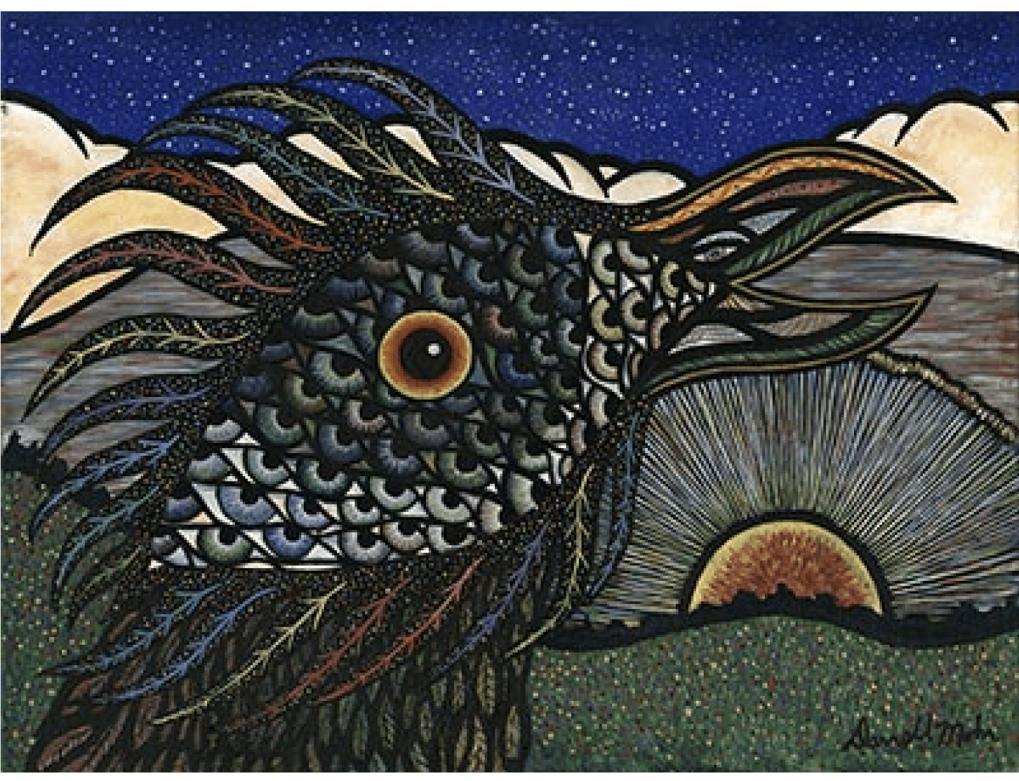 Wanted to do bird somewhat like a rooster crowing at the rising sun. Also wanted to make the head look like a large eye made up of smaller eye ‘feathers’. The surrounding ‘eyelashes’ I wanted to also make feathers.