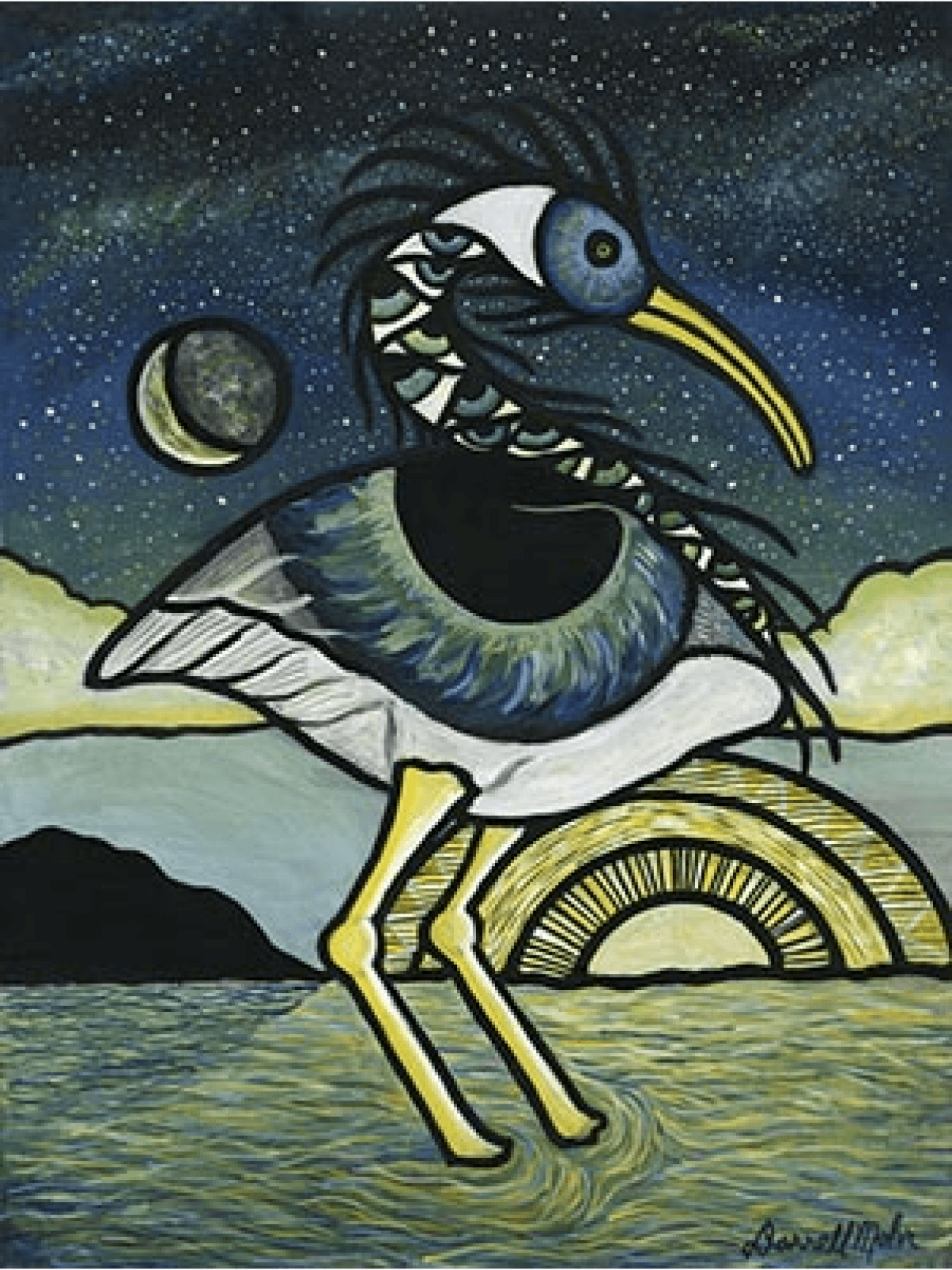For this painting I researched photos of birds whose bodies were already eye shaped. Going in I knew I wanted the body to be an eye, I wanted to decorate the neck with overlapping eyes to mimic feathers, and I wanted the head to also be an eye. The irony is the best photo I found to be an Ibis, which made the pun-loving me delighted. I always try to repeat shapes so after I drew the long arched beak, I decided I wanted arched eyelash looking feathers on the head and neck. I also then added the moon in a stage I thought would also suggest the beak.