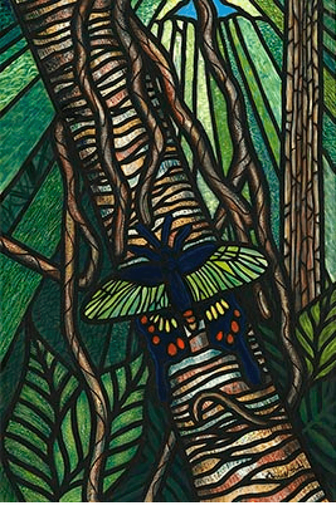This painting is based on a photo I took at Callaway Gardens in Georgia. I thought both the tree’s bark pattern and the wing segments were naturals for my stained glass style that’s been my primary focus for the last 15 years; a style I first started dabbling with in college. The photo did not include anything but the front tree and the butterfly. Started thinking how the segments on the wings somewhat reminded of shafts of light beaming through a canopy. I tried to create light beams that resembled the butterfly’s wings.