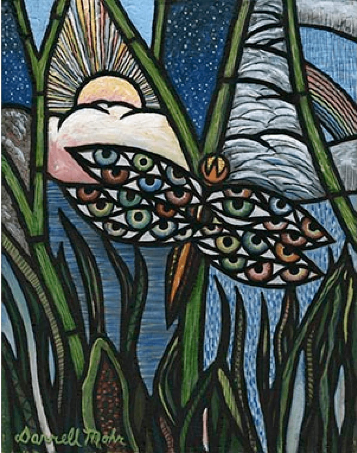 Always been intrigued by dragonflies. Their wings seemed a perfect canvas to work in my stained glass style and to incorporate eyes within. Also wanted create a surrounding environment that I could segment and play with weather and times of day/night.