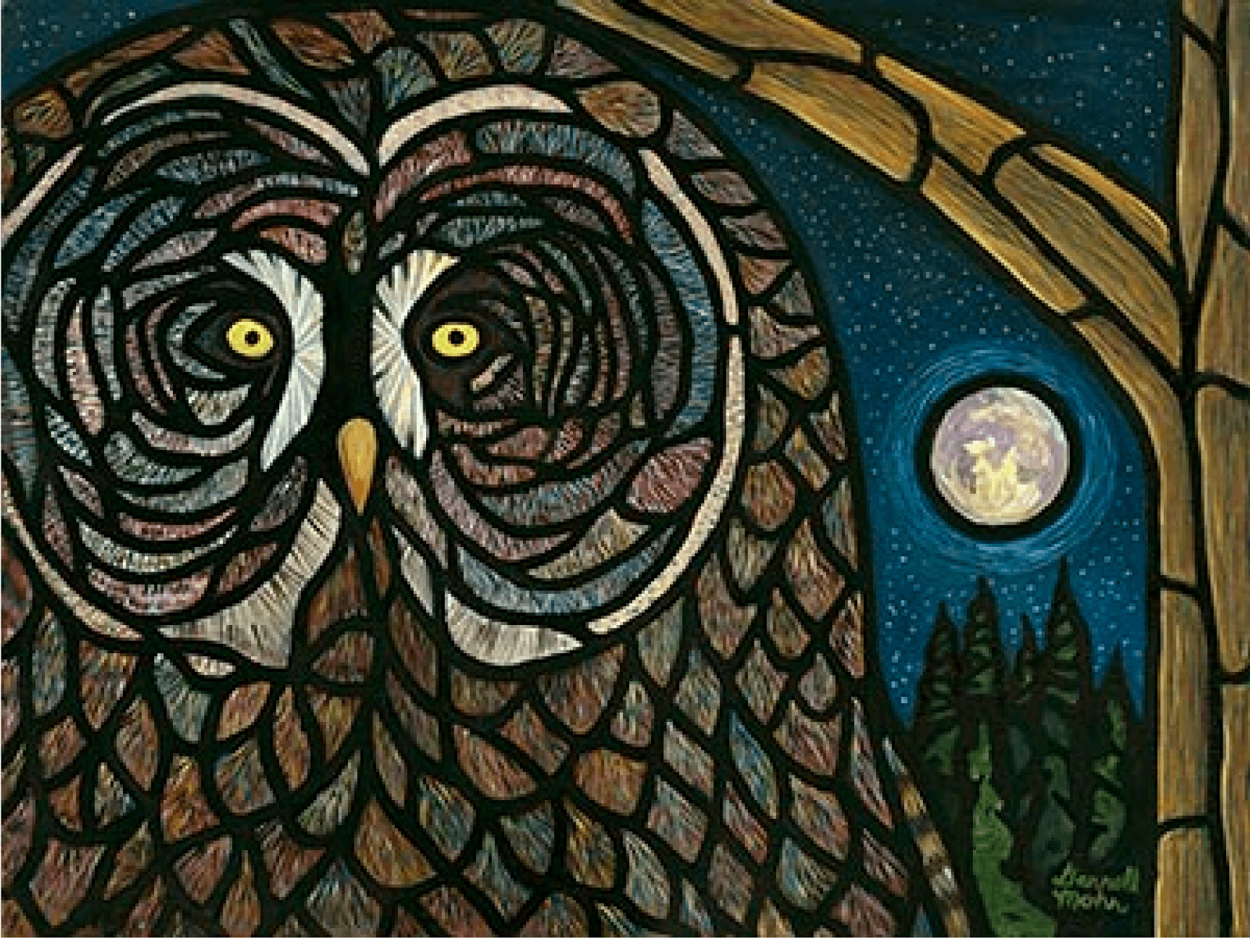 Love birds of prey. Since childhood I’ve been drawing and painting owls, hawks and eagles. This painting is a rework of what I originally did as oil pastels on canvas over a solid background. When I reimagined it in my stained glass style with a night sky and trees it took off. One of my best selling prints.