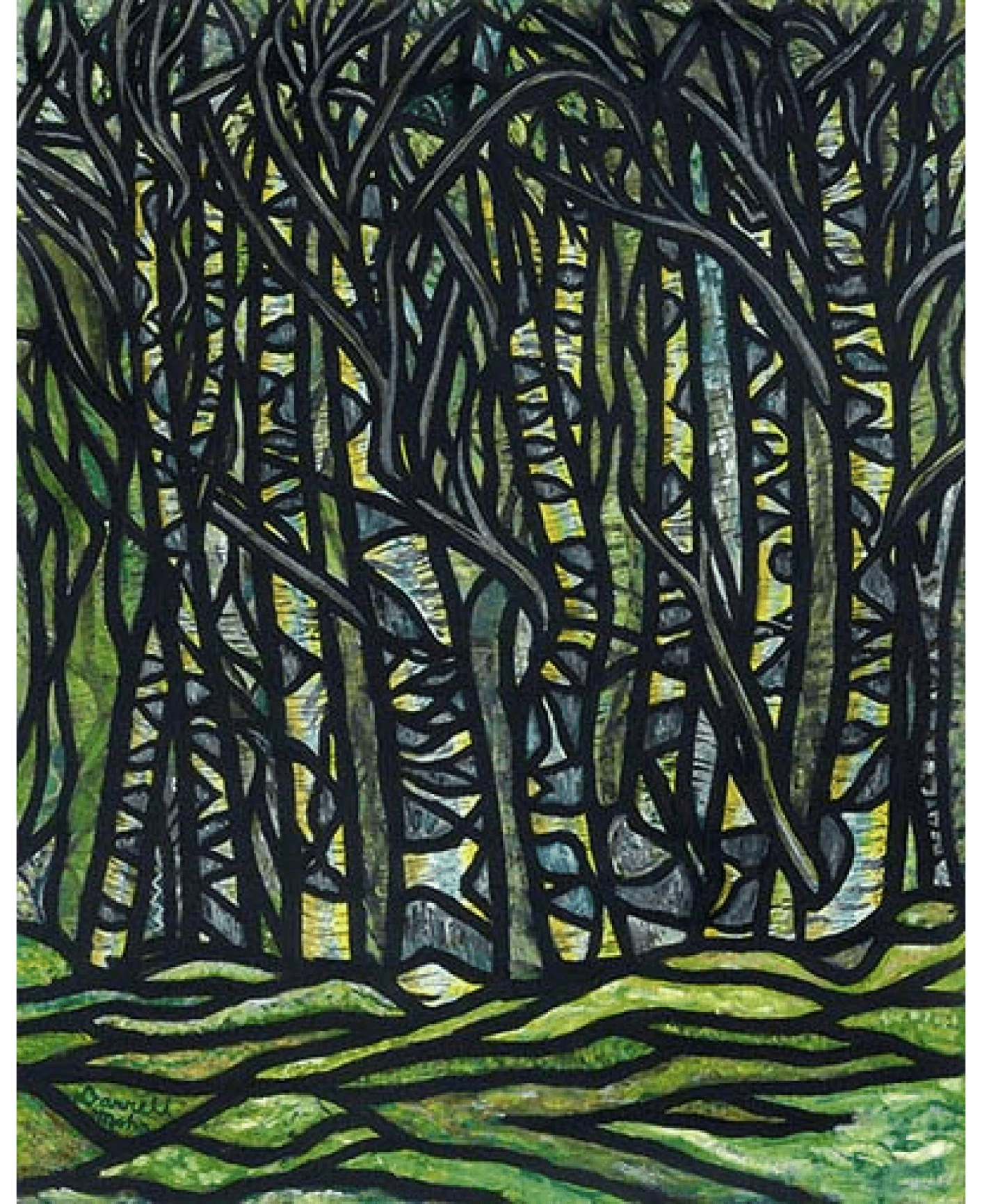 foreground vs background, turning some negative space into possible foreground. Also thought the tree bark patterns and branches would play well with my stained glass painting style.