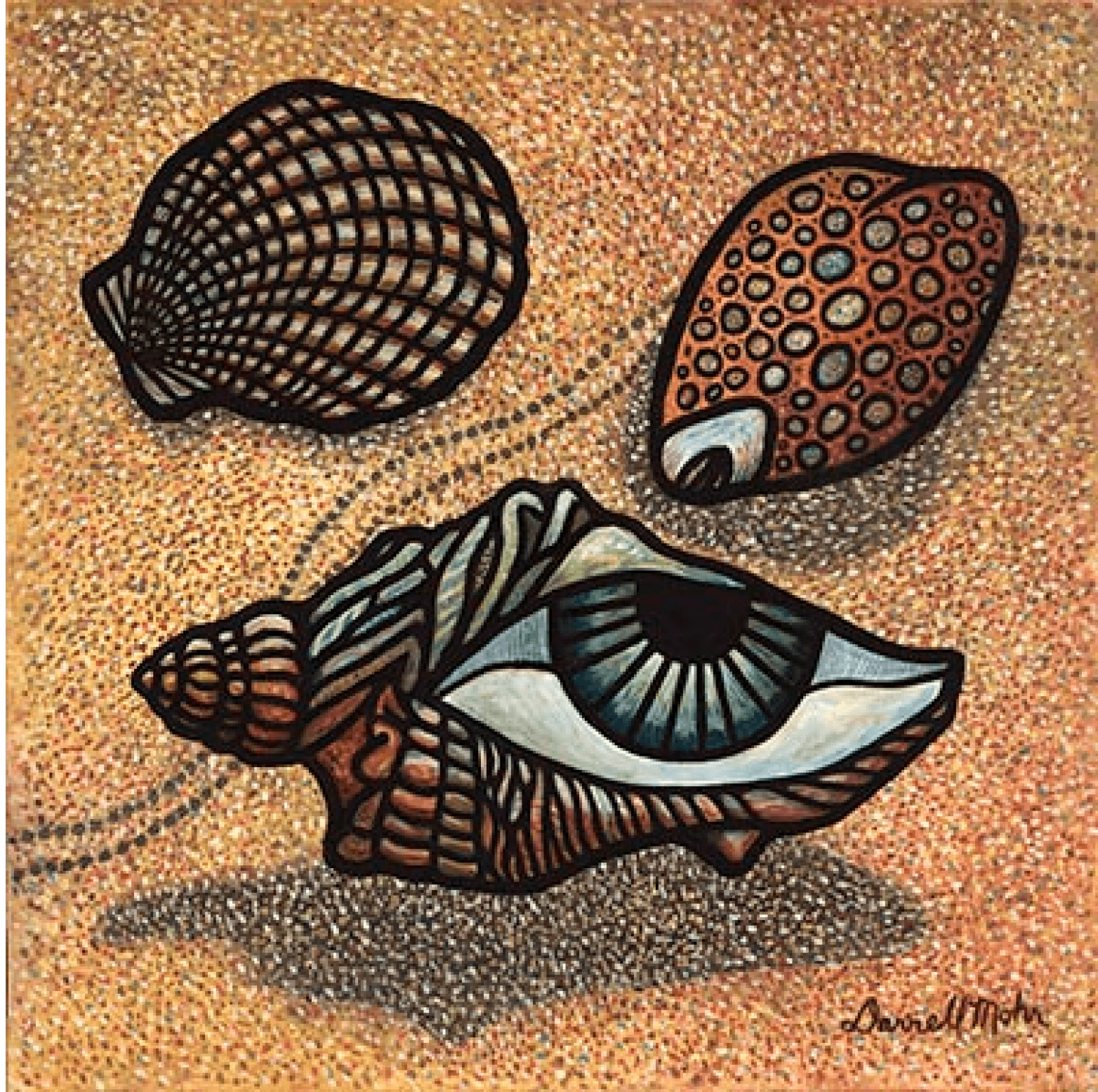 This painting is based on a charcoal drawing I did in college and was the second in what’s become a recurring them of either eyes as the ‘focus’ of the work or an incorporated element.. Didn’t start out with the eye intended but as I drew the shell opening couldn’t help but notice its eye shape. I also incorporated the radiating lines to mimic the scallop lines.
