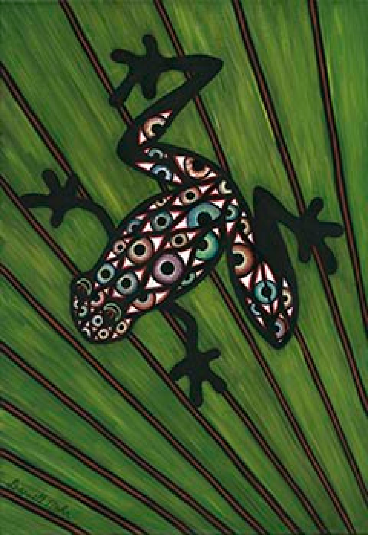 Having studied both Biology and Environmental Management in college, though not degreed in the fields, I have always been concerned about vanishing species. Frogs are extremely vulnerable to contaminants and are indeed vanishing. I often incorporate eyes to represent wildlife ‘looking at us’ for salvation. I also am extremely intrigued by animal’s use of mimicked eye patterns as a self defense against predators.